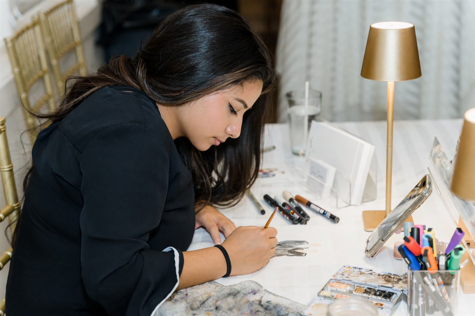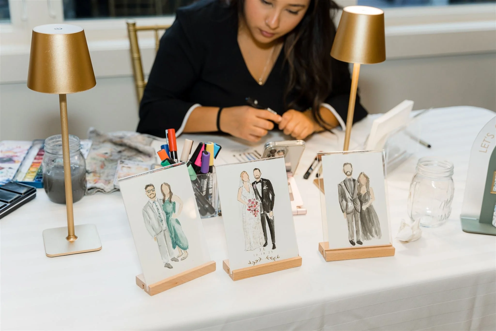 Jess Campos is a classically trained artist who specializes in live watercolor portraits. With a passion for blending artistry and connection, Jess creates personalized, hand crafted portraits that guests will treasure forever.